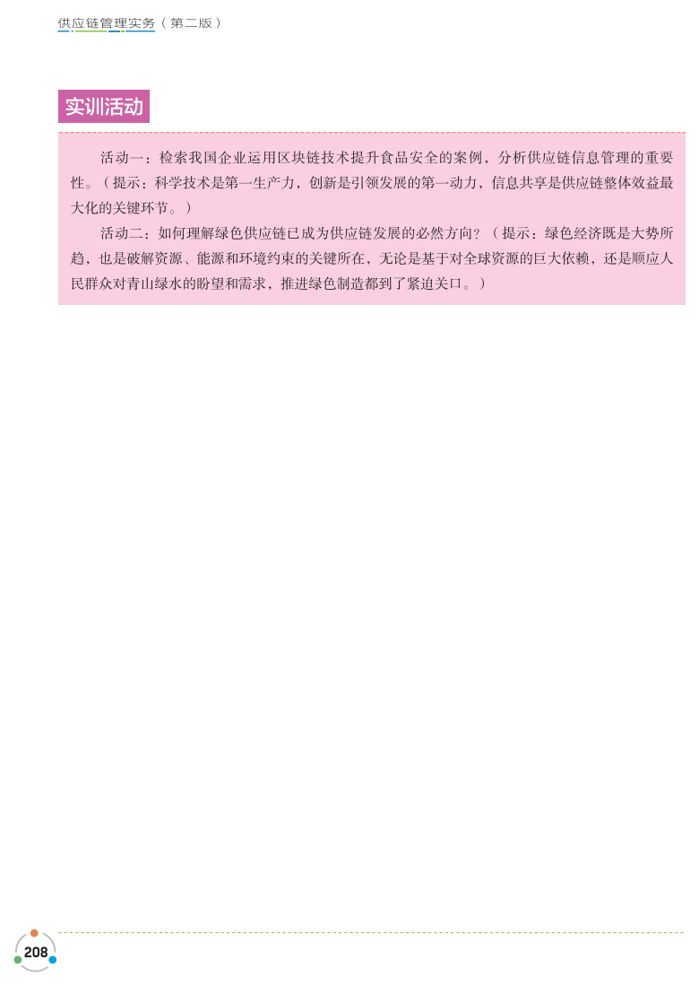 实训活动: 活动一:检索我国企业运用区块链技术提升食品安全的案例,分析供应链信息管理的重要性。(提示∶科学技术是第一生产力,创新是引领发展的第一动力,信息共享是供应链整体效益最大化的关键环节。) 活动二∶如何理解绿色供应链已成为供应链发展的必然方向?(提示∶绿色低碳发展既是大势所趋,也是推进各类资源节约集约作用的关键所在,无论是基于对全球资源的巨大依赖,还是顺应人民群众对青山绿水的盼望和需求,推动形成绿色低碳的生产方式都到了紧迫关口。)
