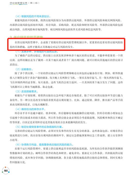 P180页,第二段修改为“在供应链风险管理中,企业除了要拥有供应链风险管理机制以外,更重要的是要有供应链风险防范的具体措施,坚持问题导向,透过现象看本质,把握好全局和局部的关系,这样才能真正具体地应对运行风险的发生。”