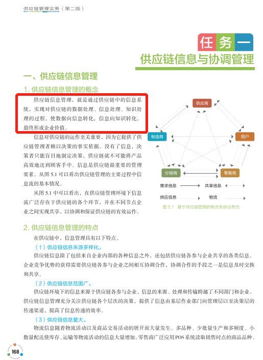 P168页,第一段修改为:“供应链信息管理,就是通过供应链中的信息系统,实现对供应链的数据处理、信息处理、知识处理的过程,使数据向信息转化,信息向知识转化,助力数字经济和实体经济深度融合,最终形成企业价值。”