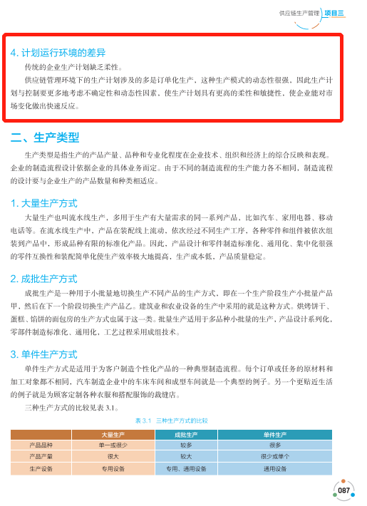 4.计划运行环境的差异 传统的企业生产计划缺乏柔性。 供应链管理环境下的生产计划涉及的多是订单化生产,这种生产模式的动态性很强,因此生产计划与控制要更多地考虑不确定性和动态性因素,使生产计划具有更高的柔性和敏捷性,使企业能对市场变化做出快速反应,适应当前以国内大循环为主体、国内国际双循环相互促进的新发展格局。