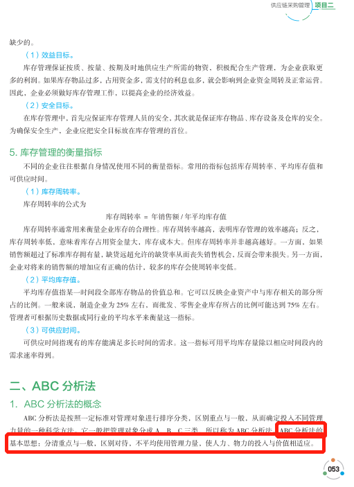 将P53原文“ABC分析法的基本思想:分清重点与一般,区别对待,不平均使用管理力量,使人力、物力的投入与价值相适应。”修改为“ABC分析法的基本思想:分清重点与一般,区别对待,不平均使用管理力量,使人力、物力的投入与价值相适应,把握好全局和局部、当前和长远、特殊与一般的关系。”