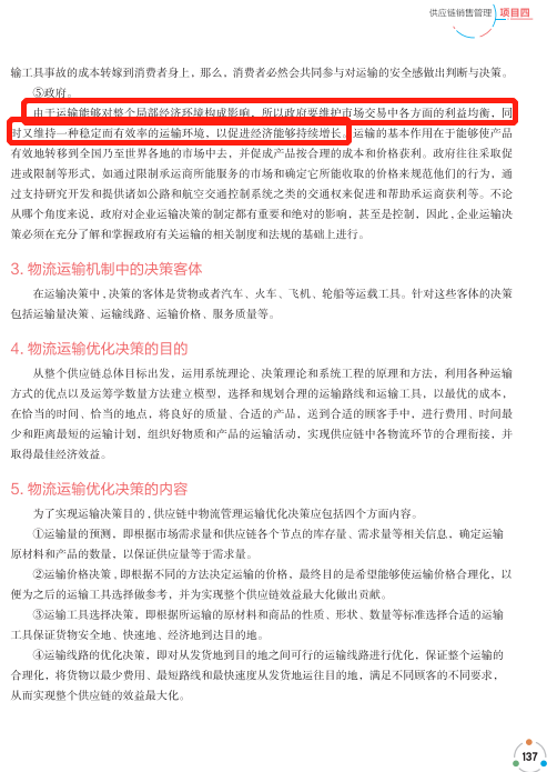 P137 ⑤政府 将“由于运输能够对整个局部经济环境构成影响,所以政府要维护市场交易中各方面的利益均衡,同时又维护一种稳定而有效率的运输环境,以促进紧急能够持续增长。”替换为“由于运输能够对整个局部经济环境构成影响,所以政府要维护市场交易中各方面的利益均衡,把握好全局和局部、当前和长远、微观和宏观的关系,同时又维护一种稳定而有效率的运输环境,以促进经济能够持续增长。”