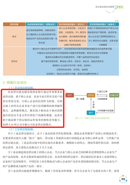 P193 (1)农业供应链金融 修改为:农业供应链金融是指商业银行通过审查整条农业供应链,基于核心企业、农业专业合作社及农户的真实贸易交易,以核心企业的信用作为担保,对供应链上的所有企业及农户进行信用捆绑的新型融资模式。这种融资模式,既能发展乡村特色产业,拓宽农民增收致富渠道,又能发展新型农村集体经济,发展新型农业经营主体和社会化服务。如图5.14所示为中粮公司农业供应链模式。