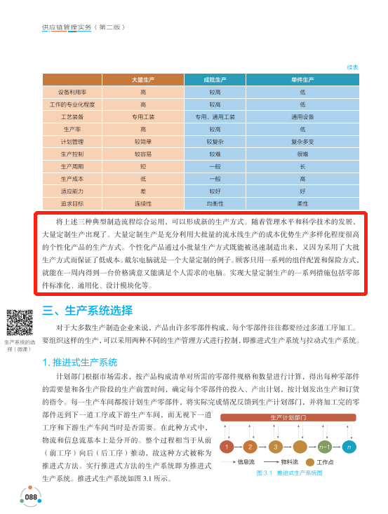 将上述三种典型制造流程综合运用,可以形成新的生产方式。随着管理水平和科学技术的发展,大量定制生产出现了。大量定制生产是充分利用大批量的流水线生产的成本优势生产多样化程度很高的个性化产品的生产方式。个性化产品通过小批量生产方式既能被迅速制造出来,又因为采用了大批生产方式而保证了低成本。戴尔电脑就是一个大量定制的例子。顾客只用一系列的组件配置和保险方式,就能在一周内得到一台价格满意又能满足个人需求的电脑。实现大量定制生产的一系列措施包括零部件标准化、通用化、设计模块化等。 供应链生产方式还应注重健全资源环境要素市场化配置体系,加快节能降碳等先进技术的研发、推广和应用,发展绿色低碳产业,推动形成绿色低碳的生产方式。